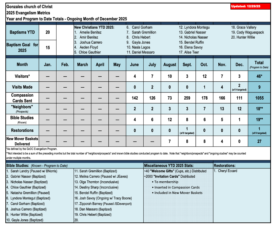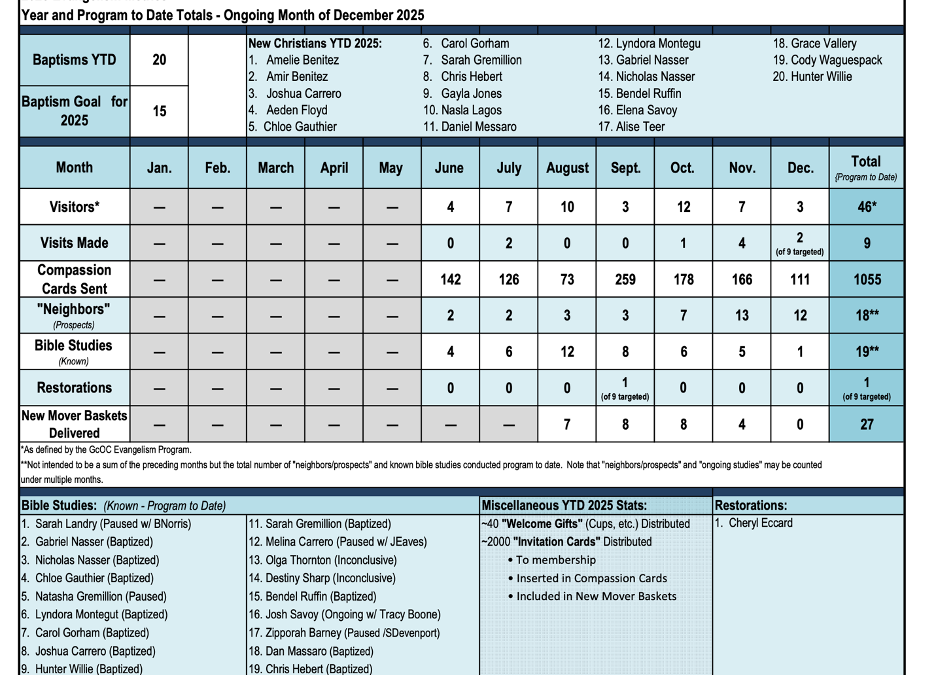 Oak Grove church of Christ, Missouri: Davie Wiseman (elder) reports, “Here are our end-of-year numbers: Goal- 12 Baptisms, actual Baptisms- 12, Bible Studies- 2 (may be more- but these were actual full Bible Studies, cards Sent- 520. Visits made- 10. We haven’t been sending any updates recently because we haven’t had scheduled/organized meetings in December. Several of our Coordinators have been out sick, traveling, etc., so we haven’t gotten clear updates. We are still sending out compassion cards and are currently discussing our goals for 2026.