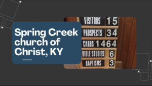 Spring Creek church of Christ, Kentucky:  David Morse (elder) reports, “We rejoice in the fact that one was added to the Lord’s church this week at Spring Creek after completing Book 3 of ‘Back to the Bible.’ Chris is one of our local neighbors who recently moved into the area with no ties to the church of Christ. We currently have several Bible studies underway and are praying that they will lead to additional baptisms in the near future. Members of our ‘White Group’ met this week to write compassion cards. We are seeing new names added to our prospect list almost every week. Our elders, minister, and leaders continue to meet each Wednesday to discuss our evangelism efforts. Number for this week include Visitors – 15, Prospects – 34, Cards Sent – 1,464, Current Bible Studies – six, Baptisms – three, and Baptism Goal – seven.”