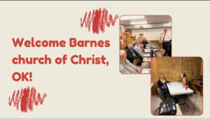 Welcome Barnes church of Christ, Oklahoma City, Oklahoma: We welcome the Barnes church of Christ to the House to House/Heart to Heart School of Evangelism. The congregation was well prepared for the training.  Although we had to reschedule due to the weather, attendance was outstanding. They have great potential. It was good to see Marion Fox, who has been a Kingdom Warrior throughout his life. I also met Gary Hinton and Brant Stubblefield, both Kingdom servants. We look forward to our work together to reach the lost.